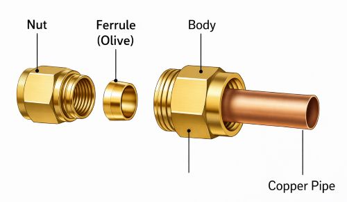 ➡️ Ferrule (also called an olive): a ring that compresses around the pipe