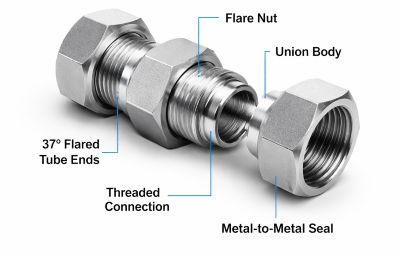 Unlike compression fittings or pipe fittings that rely on ferrules or thread sealants, flare unions seal through direct metal-to-metal contact. This makes them especially reliable in high-pressure applications where leaks cannot be tolerated.