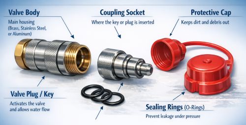 When a matching key, coupler, or valve plug is inserted, the valve opens automatically, allowing water to flow. Once the key is removed, the valve closes again, stopping the flow instantly.