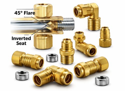 The term “inverted flare” describes the sealing method. Unlike compression fittings that seal with ferrules, inverted flare fittings rely on a 45-degree flared tube end that presses against a matching internal cone seat inside the fitting.